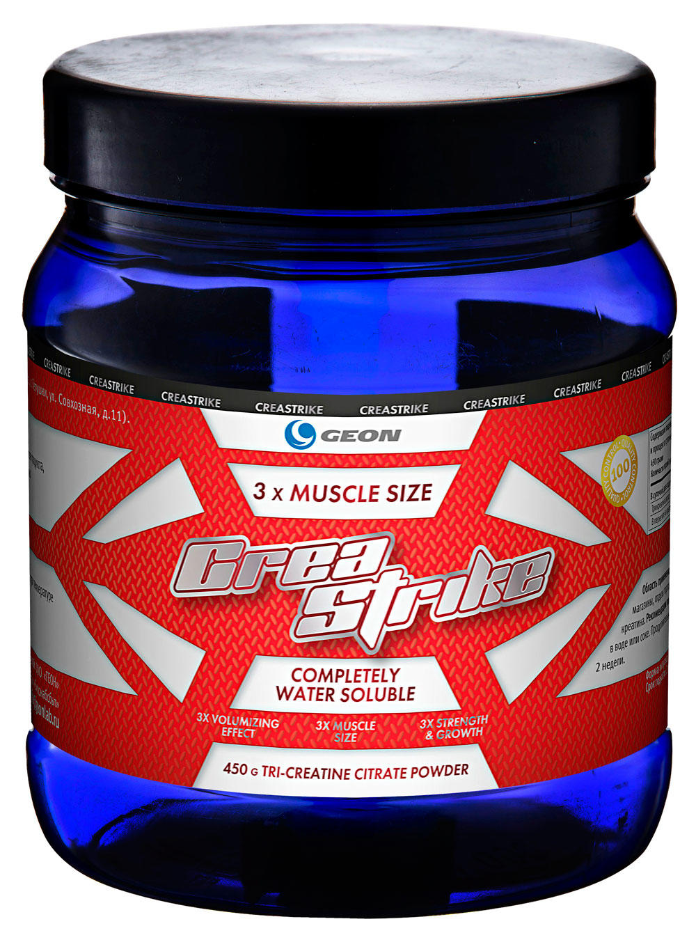 Crea Strike от G.E.O.N. - это продукт для тех, кто хочет быстро получить видимый результат. В основе CreaStrike лежит водорастворимая форма креатина - трикреатина цитрат. Креатин в такой форме имеет ряд преимуществ по сравнению с классическим моногидратом. Он быстрее и «полнее» усваивается, не требует наличия «транспортной системы».
