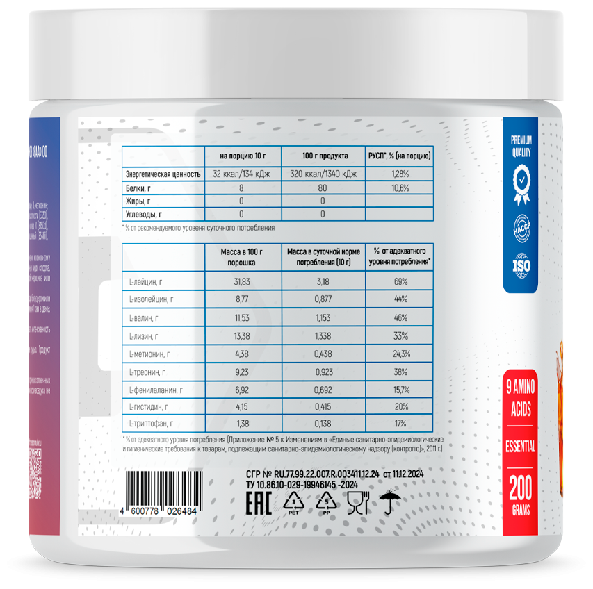 • Полный спектр EAA - 9 незаменимых аминокислот в оптимальном соотношении для быстрого усвоения.