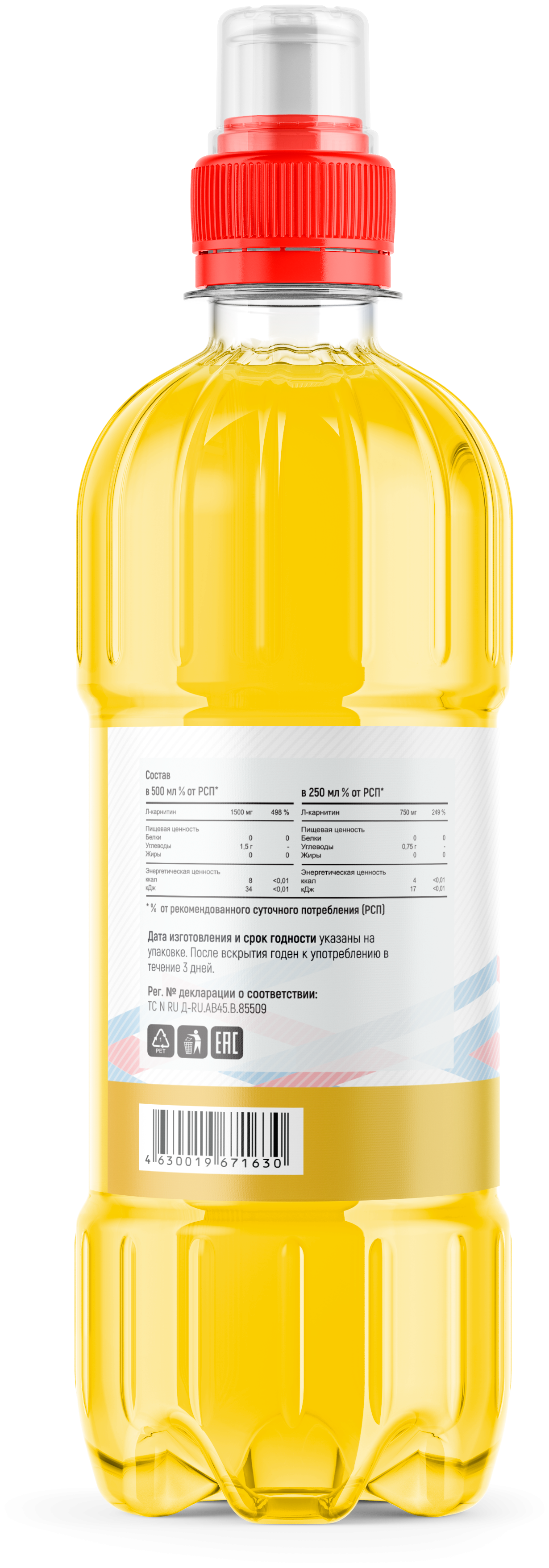 Вода подготовленная, аминокислота L-карнитин, натуральный соковый концентрат, регулятор кислотности (яблочная и лимонные кислоты), консервант (сорбат калия, бензонат натрия), стабилизатор, подсластитель сукралоза.