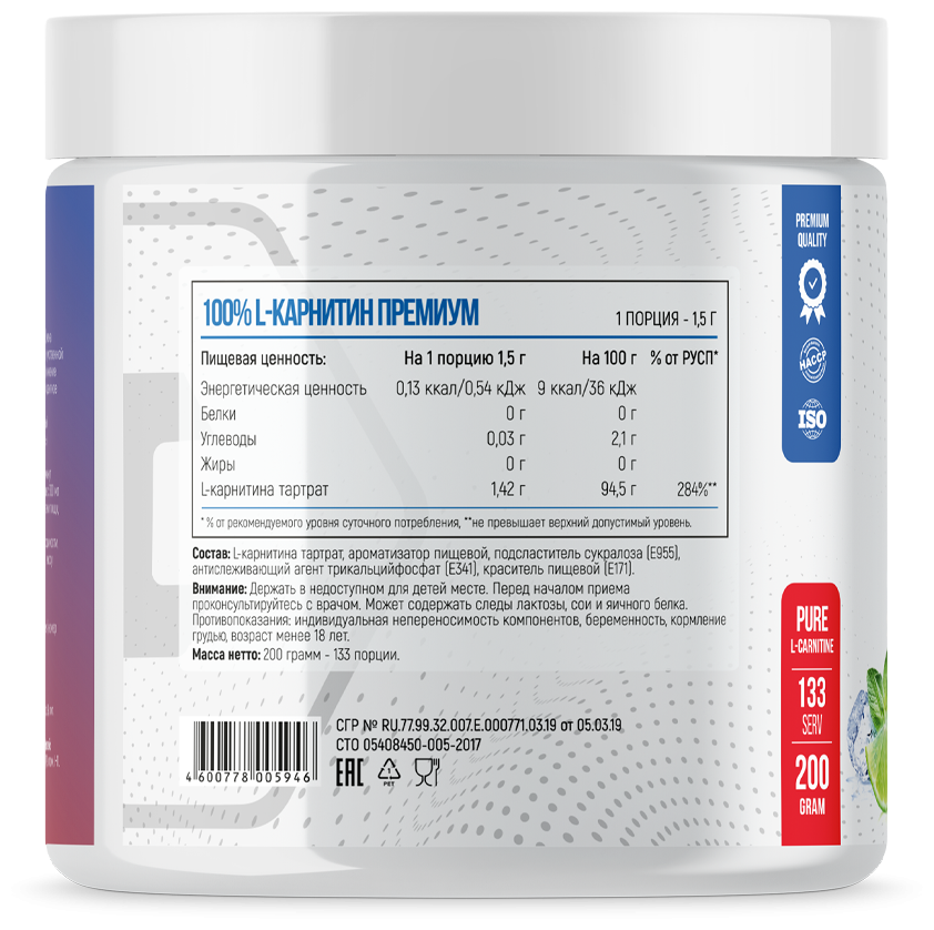 Мерная ложечка не очень удобная, влазит в неё от 0,7 до 1,2 г, можно легко перебощить с дозировкой, т.к. на один прием нужно 2 ложечки - 1,5г. Продукт привлек ценой, будем пробывать... На 1,5г приходится 1,3г левокарнитина, т.е. 87% карнитина. О,2г приходится на лимонную кислоту и прочую ерунду. Детальный состав: Л-Карнитин тартрат, лимонная кислота, ароматизатор идентичный натуральному, подсластитель сукралоза, краситель натуральный, антислеживатель трикальцийфосфат