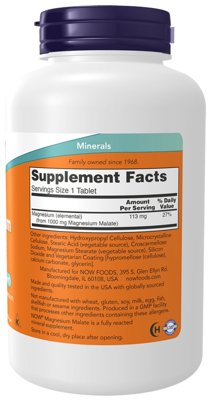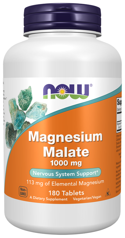 Магния малат - магниевая соль яблочной кислоты, хорошо облегчает гипомагниевые судороги мышц , снимает утомление и интоксикацию алюминием в организме. Он считается наиболее подходящей формой для снятия расстройств, связанных с энергией. Малат магния поможет справиться с хронической усталостью или депрессией. Его рекомендуют принимать утром.