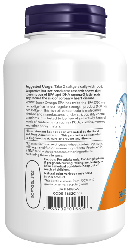 Super Omega EPA - это насыщенная общеукрепляющая добавка. Она разработана основе концентрата рыбьего жира, очищенного от бесполезных и тяжелых примесей. В каждой капсуле вас ожидает удвоенная порция полиненасыщенных жиров. Никакого ГМО и сои. Добавка легко усваивается организмом, не вызывает дискомфорта и побочных эффектов, а главное, начинает действовать с первой порции.