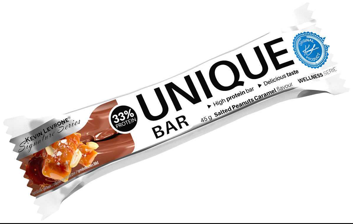 С UNIQUE BAR вы больше не останетесь голодным. Это невероятно питательный протеиновый батончик, в котором всего 160 калорий. Он изготовлен из натуральных ингредиентов, не содержит ГМО, усилителей вкуса и других вредных примесей. Вместо этого вас ожидает целых 15 грамм белка, в обертке из шоколада, карамели или соленого арахиса.