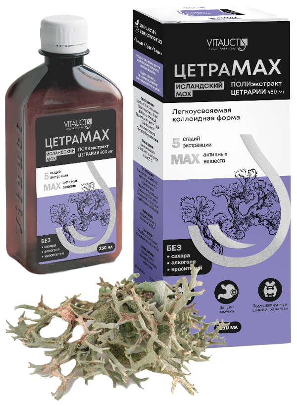 Исландский мох - уникальный природный антибиотик, который наиболее эффективен при заболеваниях верхних дыхательных путей. Экстракт цетрарии избавляет от бронхита и от кашля, выводит мокроту, а также помогает организму восстановиться после болезней. Цетрария обладает противоопухолевой, противомикробной, противовоспалительной и противогрибковой активностями. Она оказывает муколитическое, обволакивающее и гастропротекторное действие.