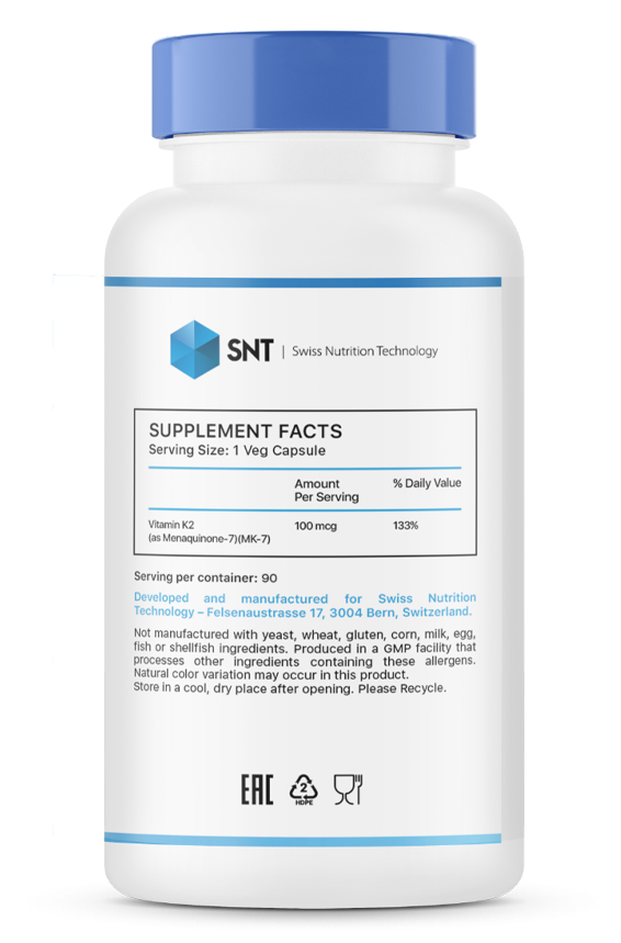 Известно, что витамин К отвечает за синтез нескольких факторов свертывания крови и формирование сильных, здоровых костей. Vitamin K2 MK7 - это уникальная биодоступная форма витамина К2 без сои, которая играет ключевую роль в поддержании здоровья артерий благодаря своей способности обеспечивать правильный обмен кальция в кровеносных сосудах и артериях.
